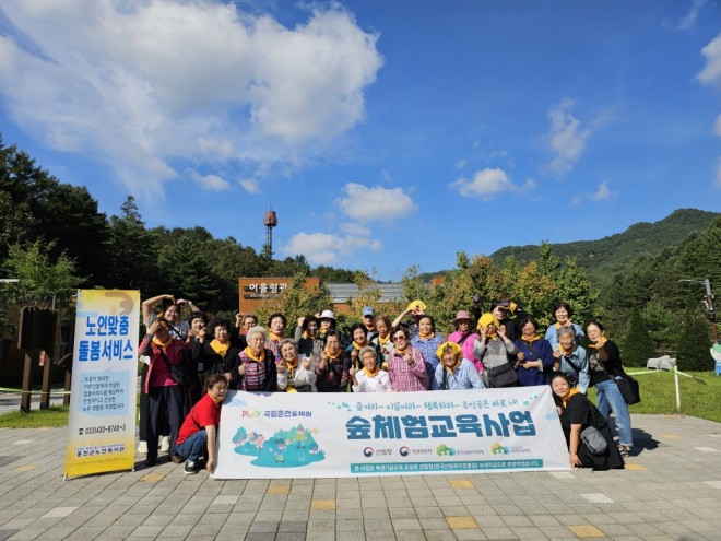 3. 내 용 : 노인맞춤돌봄서비스 대상 어르신 20명을 모시고 국립춘천숲체원에서 ‘나눔의 숲 캠프’를 진행했다. 이번 프로그램은 평소 외부 활동이 어려운 고령 어르신들에게 자연 속에서 휴식할 수 있는 기회를 제공하고, 정서적 안정과 심신 회복을 돕기 위해 마련됐다. 참여 어르신들은 깊어가는 가을 숲속에서 산림 체험 활동을 즐기며, 오랜만의 야외활동을 통해 외로움과 우울감을 해소하고 활력을 되찾는 시간을 가졌다.