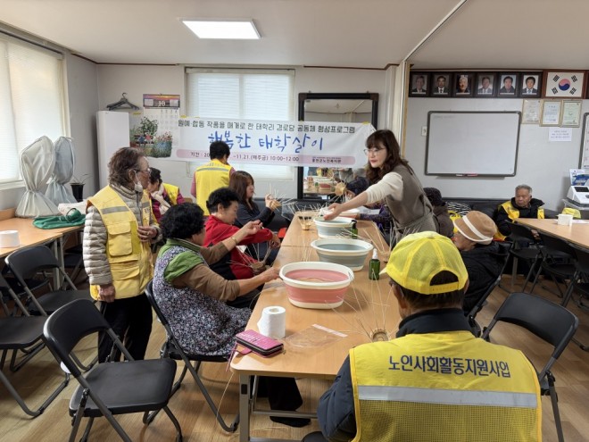 3. 내 용 : 태학리 경로당 어르신들과 복지관 이용회원 어르신이 함께 태학살이 프로그램에 참여하여 전등 갓 을 만들었습니다.