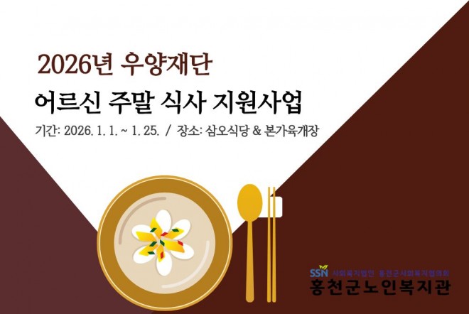 3. 내 용 : 우양재단 주말 어르신 먹거리 지원사업에 선정되어 2026년 1월 중 주말에 저소득 어르신을 대상으로 식사 지원사업을 운영하고 있습니다.